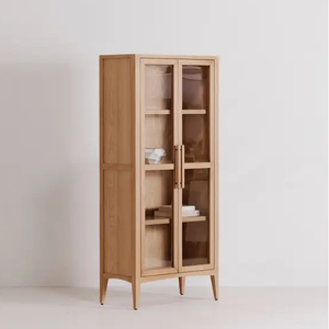 Adding texture and visual intrigue with mixed materiality and supported by a beautifully sculpted solid oak frame, the Harrington tall cabinet’s shelves are made from woven natural cane—beautiful detailing that is revealed through its tempered glass doors punctuating its airy design. Fine craftsmanship brings a contemporary touch to a rustic feel adding eye-catching allure.