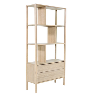 TheRunway Bookcase features a sleek, modern silhouette in a warm light oak finish that seamlessly blends Scandinavian simplicity with functional design. Solid oak construction with gently curved edges and open shelving pairs beautifully with two integrated drawers, offering ample space to display décor and tuck away essentials. Its open-back design keeps the piece feeling airy and visually light while adding a refined, timeless touch to any room.