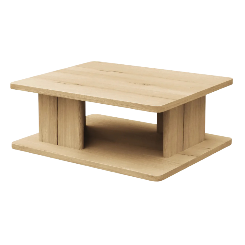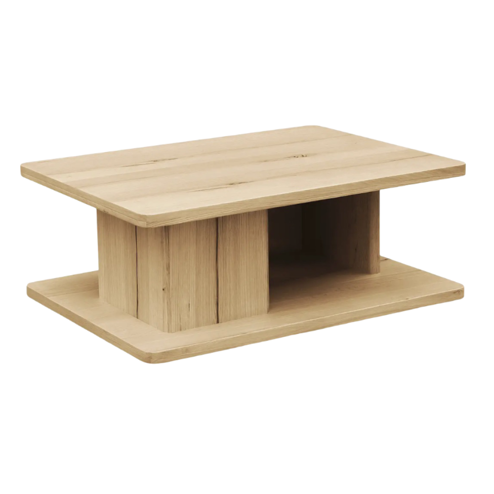 The Casey coffee table harmoniously blends rustic charm with contemporary aesthetics. A distinctive vertical support adorned with a refined bullnose edge adds sculptural grace to its minimalist design. Ample open storage beneath the tabletop offers practical display or storage solutions.