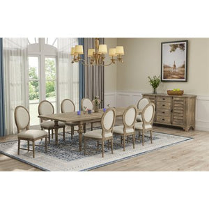 Interlude combines a rustic nature with classic portrait-back side chairs to create a French country look for today. Pine solids and veneers and American White Ash solids are brought together to craft the planked tabletops, turned legs, and fluted details. The collection includes dining height as well as gathering height pieces. The dining table features a signature butterfly leaf with a cable driven slide system for easy one-hand operation. A matching server with four drawers and two louvered doors complete this presentation. Cup pulls and exposed hand-latch rods add just the right touch of authenticity, while a soft whitewash settles in the heavily hand-distressed sandstone buff finish, adding texture to the contemporary French country collection.