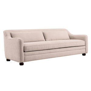 The Amira sofa offers warmth and comfort with its gracefully curved high back and subtly flared arms. Upholstered in durable polyester fabric with piping cushion details. The feather and fiber topped bench seat cushion creates luxurious repose. Generously proportioned lumbar cushions and solid wood feet complete this centerpiece.