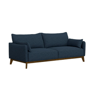 Bringing mid-century to the modern age, the Aria collection is sure to add character to your space. Wrapped in a classic navy fabric, each piece sits atop a rich, walnut-toned exposed solid wood frame. Slightly flared legs and prominent welting add to the sophisticated look. Hidden storage in the perfectly sized rectangular ottoman puts blankets, games, and more at your fingertips. Equipped with a split top that reverses to wood trays, Aria is ready to help you entertain or enjoy a quiet evening alone.